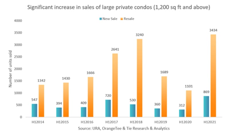 According to URA Realis data, sales of large condominiums of at least 1,200 sq ft rose by 205.5 per cent from 1,419 units (including subsales) in the first half of 2020 to 4,335 units in the first half of 2021.