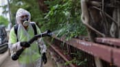 Chinese state television has shown workers spraying clouds of disinfectant around city streets, residential areas, construction sites and other areas where people may come into contact with virus-bearing mosquitoes that are born in standing water.