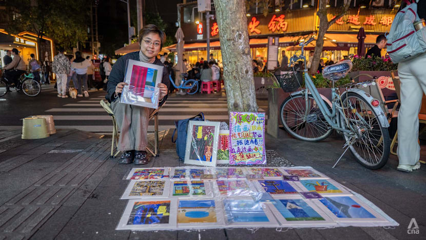 On Yulin West Road, often romanticised for its folk-music bars and arts community, a young woman sits on a low bench, laying out postcards and prints as evening crowds drift past.