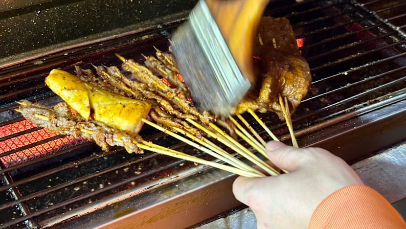 Locals relaxing on bamboo chairs scattered across a lively teahouse courtyard while a street vendor bastes meat skewers that sizzle on a charcoal grill.
