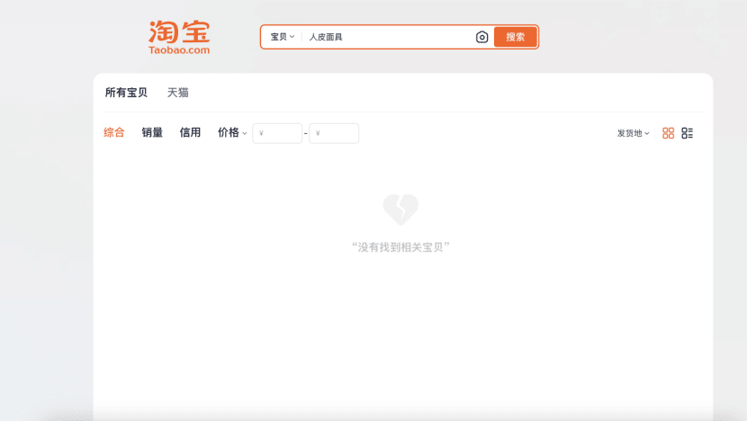 Checks by CNA on Jul 3 on platforms like Taobao, Pinduoduo and 1688 found that the term "human mask" or "ren pi mian ju" in Chinese was blocked, yielding zero results. But a swap of keywords to "silicone mask" or "gui jiao mian ju" still showed results.