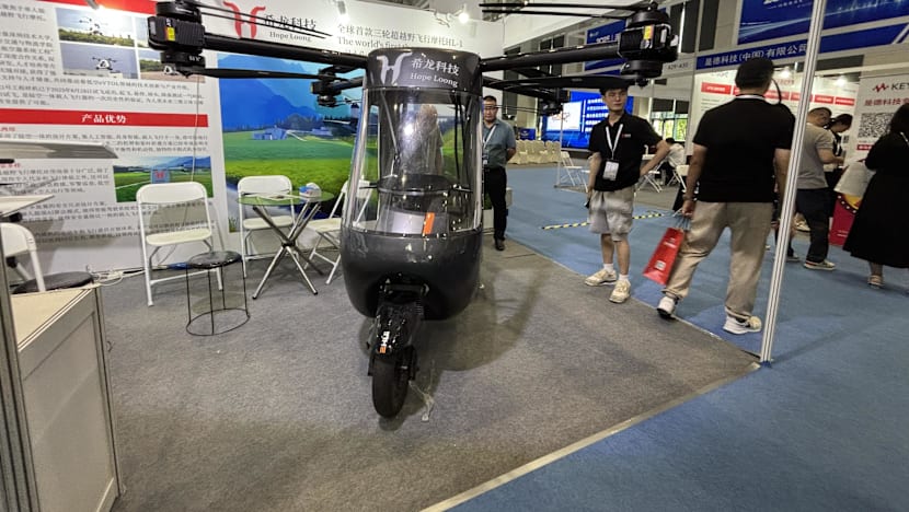 Homegrown start-up Hope Loong is showing off its prototype “flying motorbike”, a three-wheeled craft with rotors tucked away, designed to roll through a carpark as easily as it might hop over traffic for a few minutes in the air.