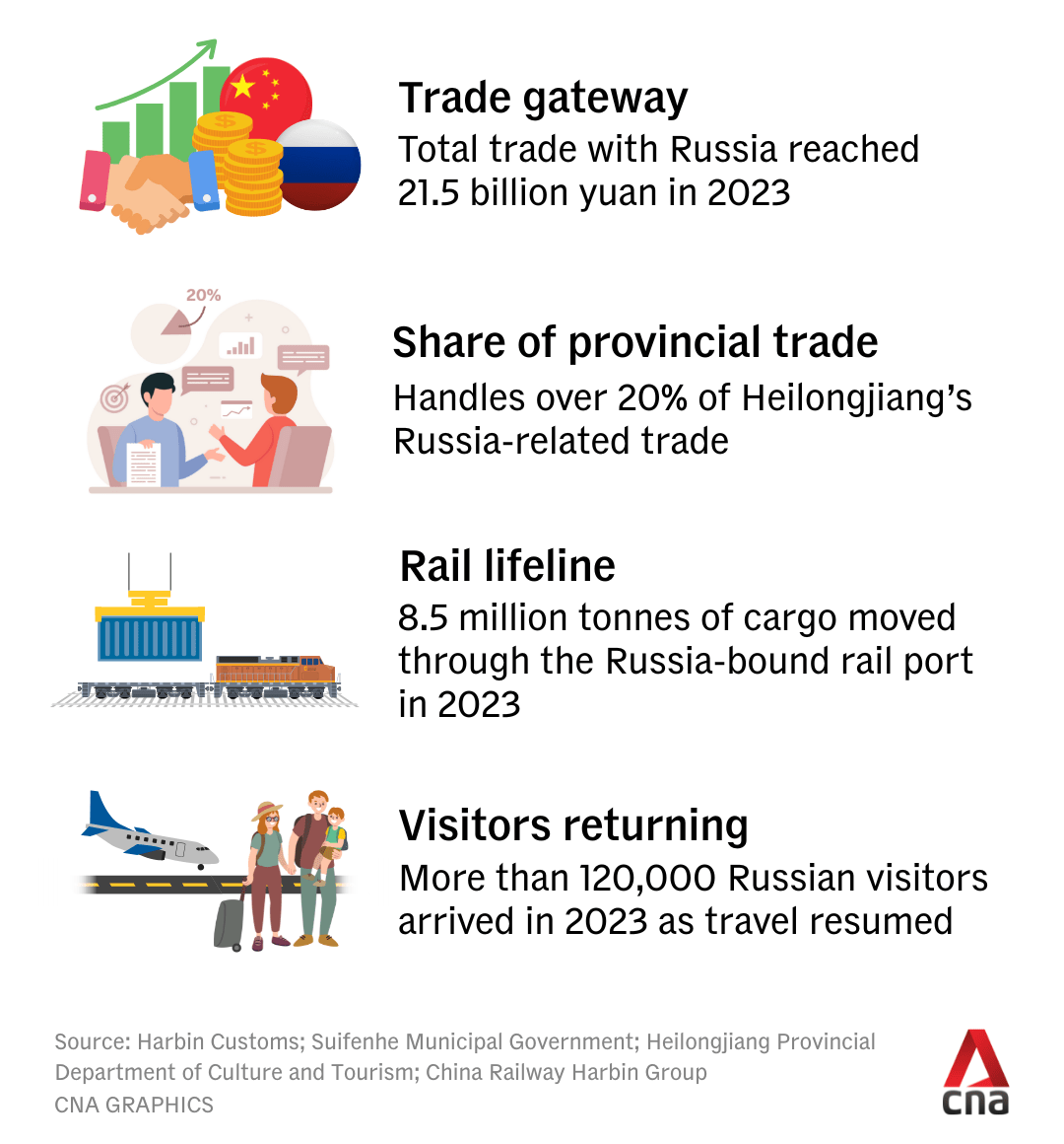 Rail freight volumes reached about 8.5 million tonnes in 2023 - mostly coal and timber, while road ports handled another 450,000 tonnes of goods, according to China Railway Harbin Group figures.