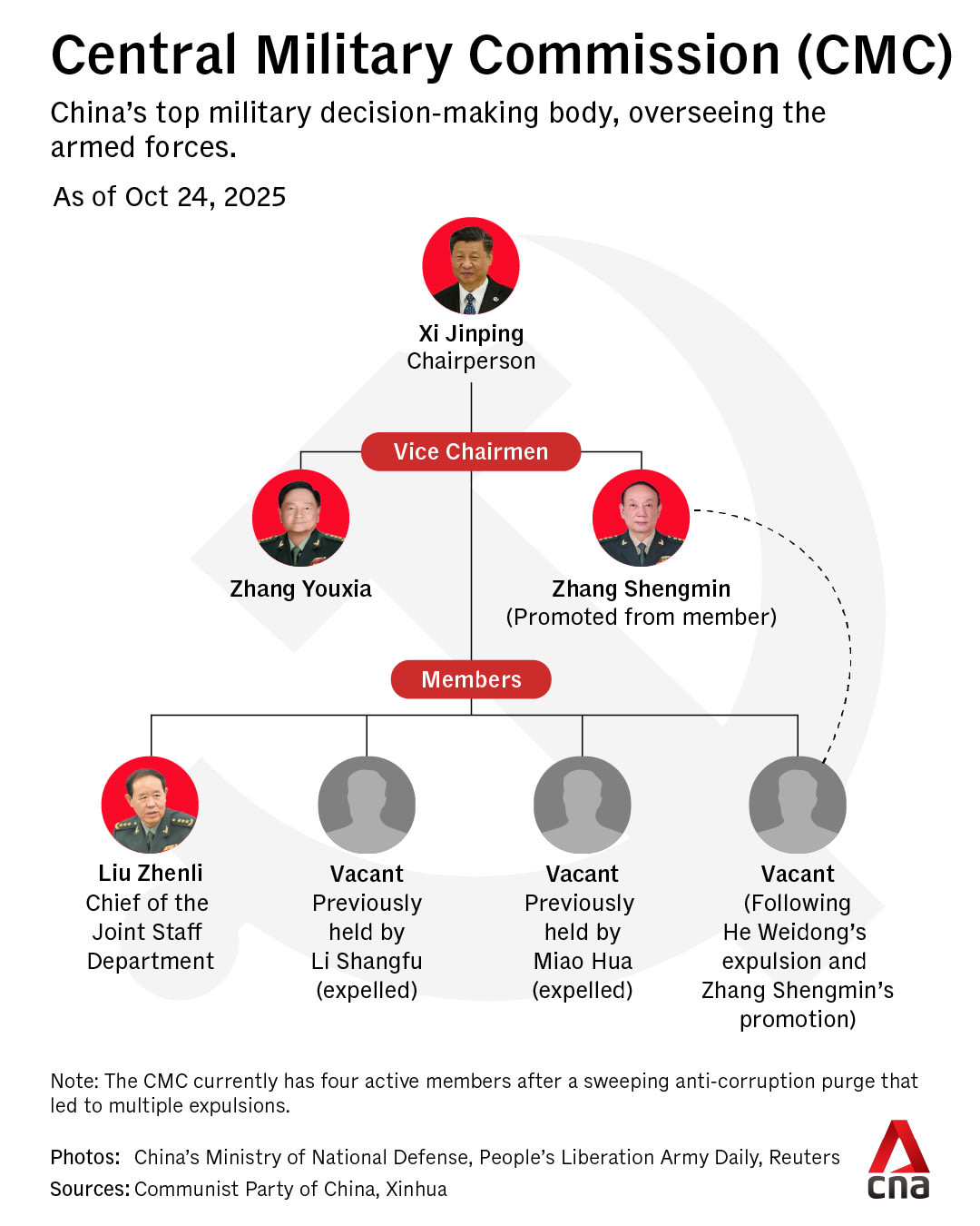 Aside from Xi and Zhang Shengmin, the other two sitting members of the CMC are Zhang Youxia and Liu Zhenli.