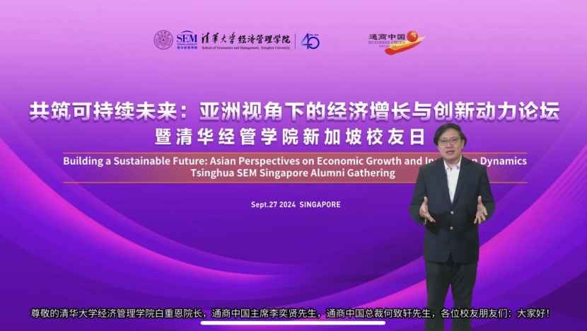 Mr Andrew Chin with the digital human he created, originally intended for a one-minute Chinese congratulatory speech at the Tsinghua SEM Singapore Alumni Gathering on Sep 27, 2024. (Photo: CNA/Melody Chan)