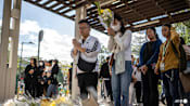 Crowds streamed into a small park next to the charred remains of Wang Fuk Court, the Tai Po residential complex that burned for more than 40 hours. Many carried white or yellow flowers, leaving handwritten notes and photographs for neighbours, friends and strangers lost in the blaze.