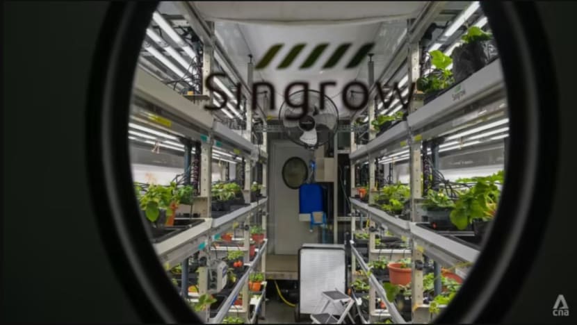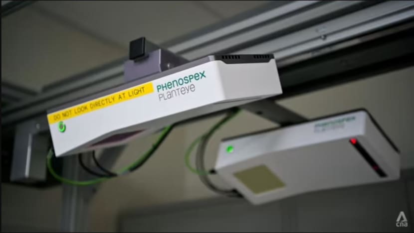 Direktur teknologi Singrow, Young Chang, menunjukkan kepada CNA cara kerja PlantEye, sebuah mesin di Agritech Centre NUS yang mampu memindai ukuran daun, warna, panjang batang, dan biomassa tanaman. Mesin ini adalah bagian dari fasilitas bersama untuk usaha pertanian perkotaan yang disediakan Agritech Centre, sebuah pusat teknologi pertanian yang diinisiasi NUS Enterprise. Singrow adalah salah satu perusahaan perintis yang didukung oleh NUS Enterprise.