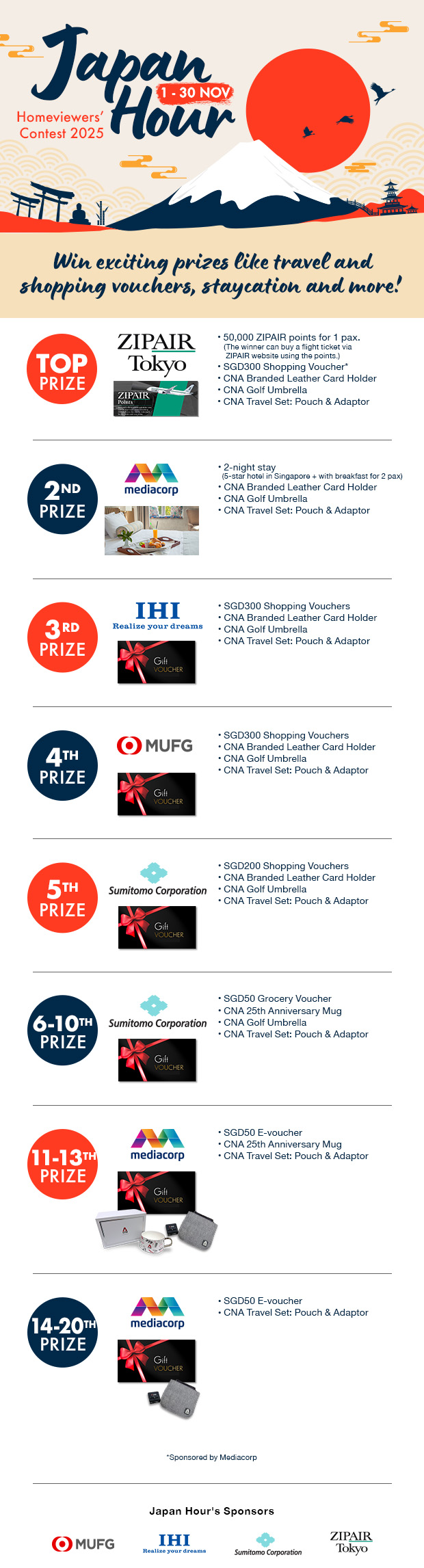 - Japan Hour Homeviewers’ 2025 Contest (hereinafter referred to as the “Contest”) is organised by Mediacorp Pte. Ltd. (hereinafter referred to as “Mediacorp”). These Terms and Conditions shall apply to all stages of the Contest.