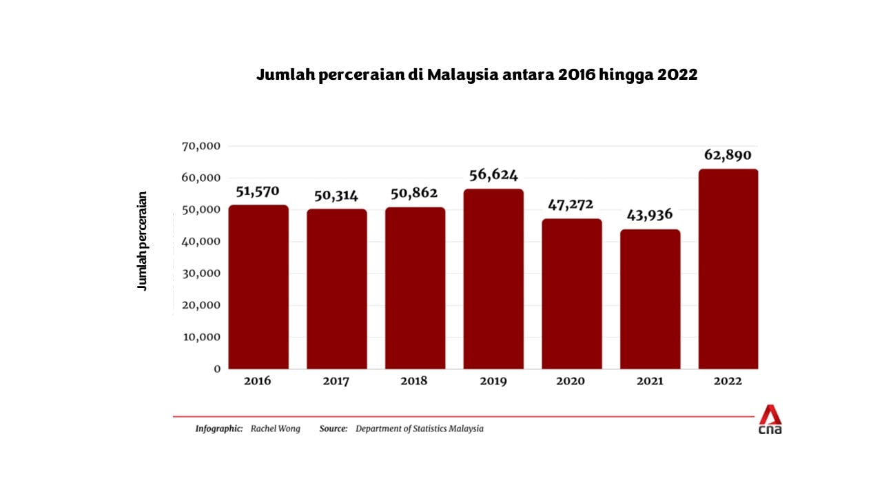 SINGAPURA: Jumlah perceraian di Malaysia mencatatkan lonjakan besar pada tahun lalu dengan peningkatan kepada 62,890 dibandingkan dengan 43,936 pada tahun sebelumnya.