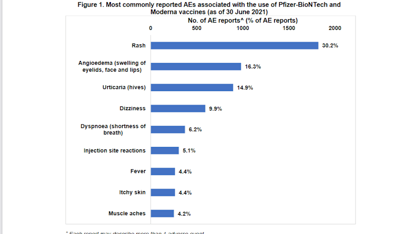 More broadly, as of June 30, 6,606 suspected adverse events had been reported out of a total of 5,470,425 vaccine doses given, comprising 0.12 per cent of administered doses.