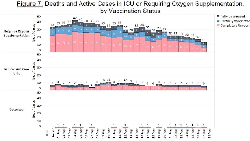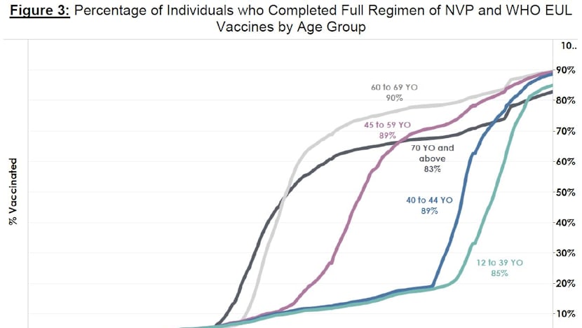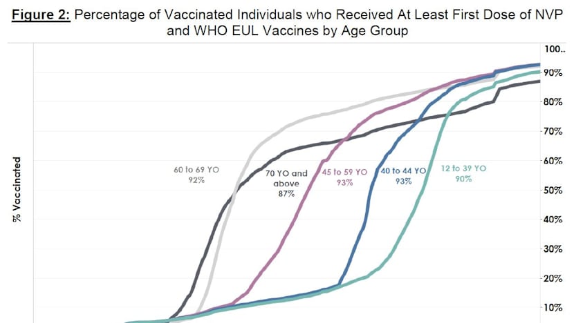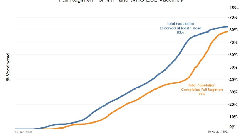 As of Aug 26, 79 per cent of the population had completed their full regimen or received two doses of Covid-19 vaccines, and 83 per cent had received at least one dose.