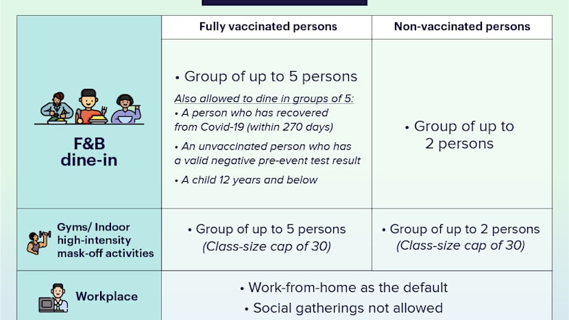 Finance Minister Lawrence Wong, who co-chairs the task force, said that people who are not fully vaccinated would be allowed to join a group of five provided that they have tested negative for Covid-19 on a pre-entry test or had fully recovered from Covid-19 and hence have immunity against the coronavirus.