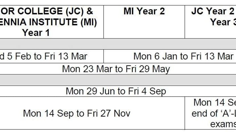 Students in their first year at junior colleges and at the Millennia Institute will start on Wednesday, Feb 5, while the rest of the students will start school on Monday, Jan 6.
