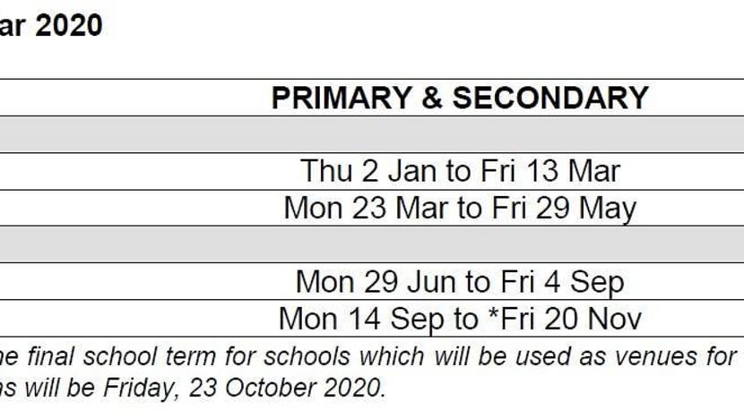 SINGAPORE — The 2020 school year for all primary and secondary schools will start on Thursday, Jan 2, and end on Friday, Nov 20, the Ministry of Education (MOE) announced on Tuesday (Aug 13).