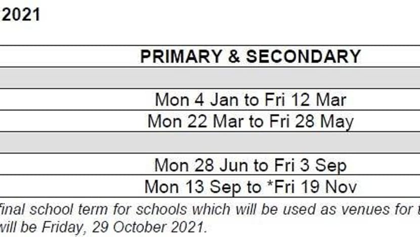 SINGAPORE — The 2021 school year for all primary and secondary schools will start on Monday, Jan 4, and end on Friday, Nov 19, the Ministry of Education (MOE) announced on Monday (Aug 17).