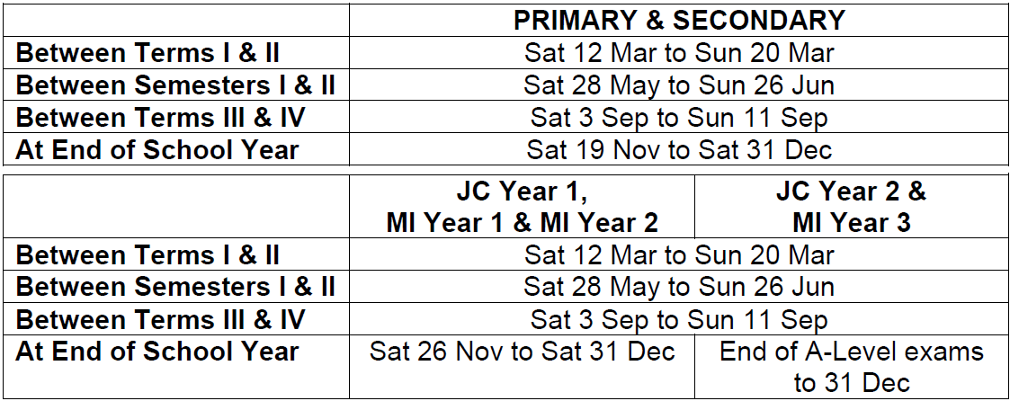 Junior colleges and Millennia Institute share the first three vacation periods as primary and secondary schools.