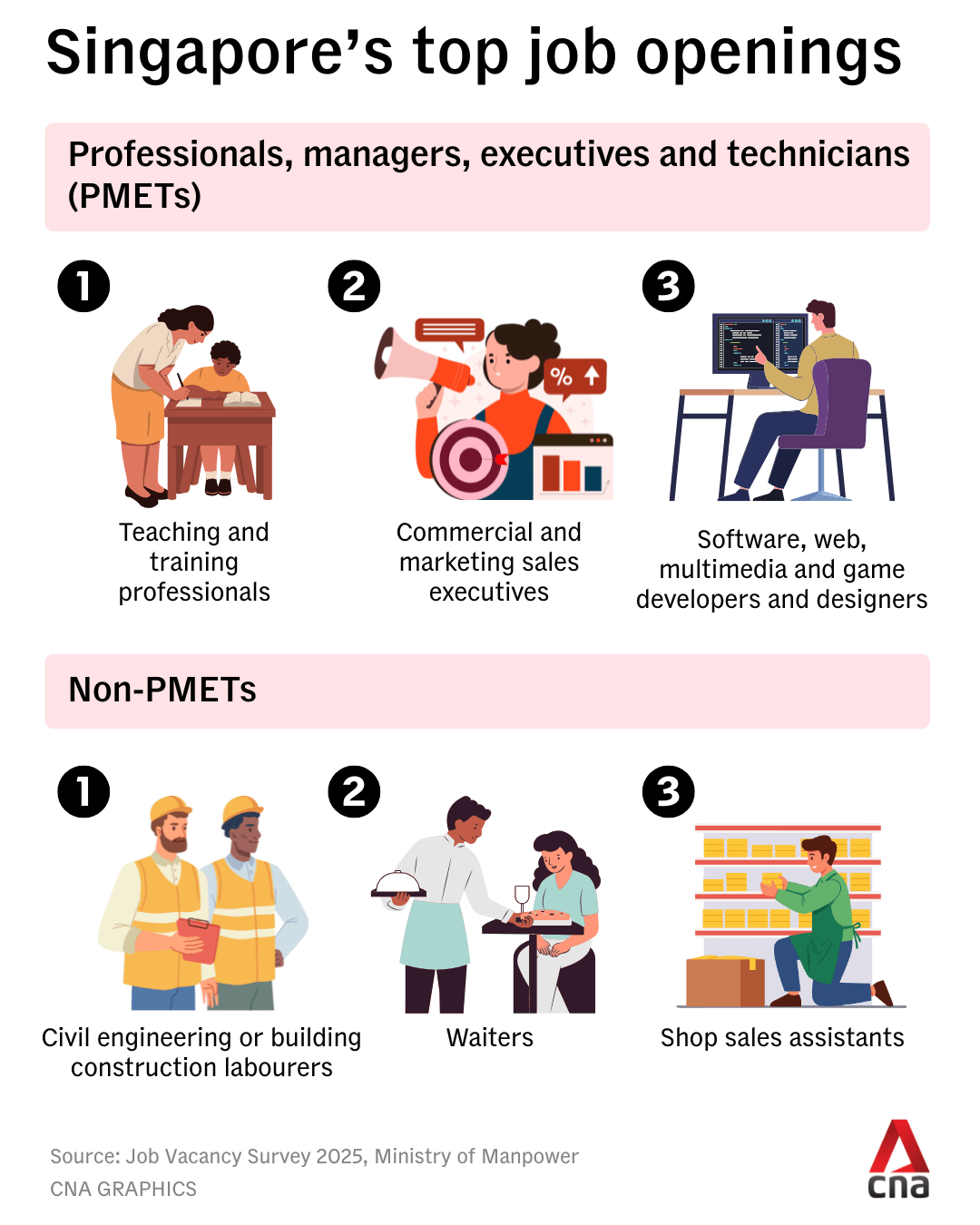 The top PME vacancies in 2025 were for teaching and training professionals, commercial and marketing sales executives and software, web, multimedia and game developers and designers, according to Manpower Ministry data.