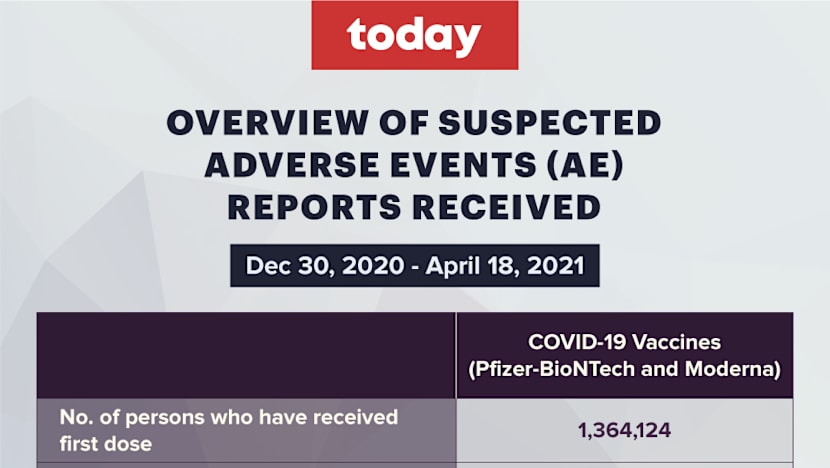 HSA is also monitoring other severe adverse events such as the cases of unusual blood clots following the use of the Oxford-AstraZeneca and the Johnson & Johnson vaccines overseas, as well as reports of severe medical events such as stroke and heart attacks.