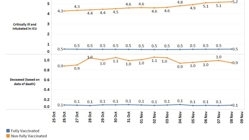 - The number of fully vaccinated patients who were critically ill in ICU was at 0.5 per 100,000 population and for non-fully vaccinated patients, it was 5.2