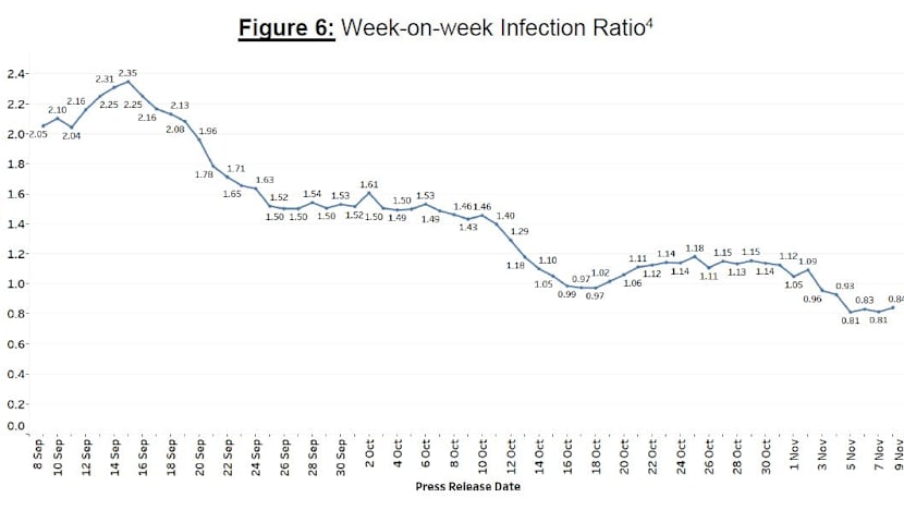 - The ratio of community cases in the past week compared with the week before stood at 0.84, up from the 0.81 reported on Nov 7