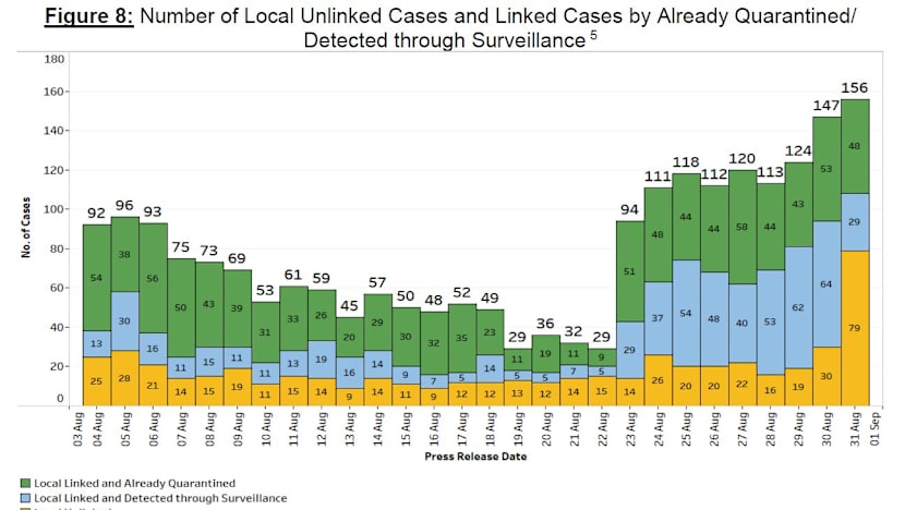 Locally transmitted cases numbered 156 — highest since July 22, when 162 were reported