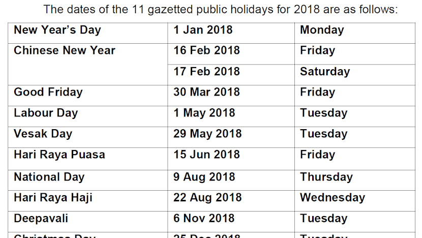 SINGAPORE — Expect at least four long weekends next year, three fewer than this year based on the Manpower Ministry (MOM) release of gazetted public holidays for 2018.