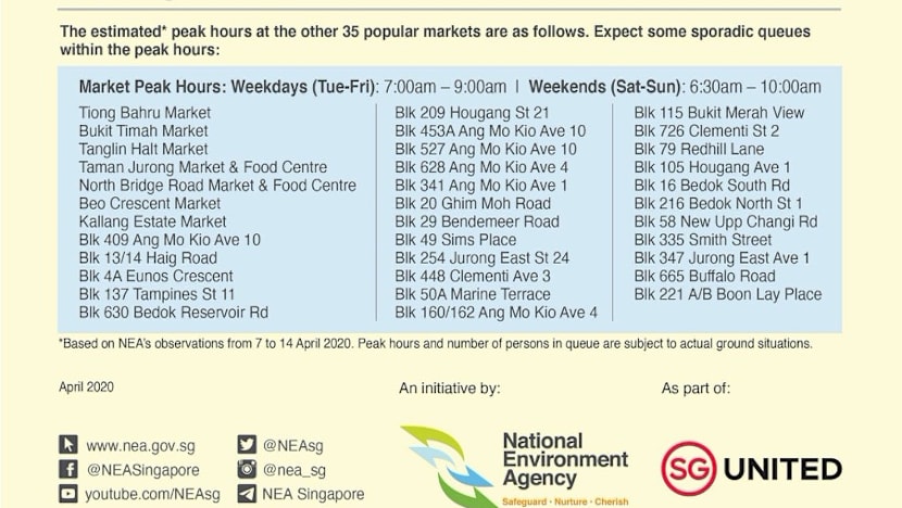 To further ease the crowds at these locations, NEA has produced a flyer showing the estimated peak hours and number of patrons in the queues at these markets. This is to better guide regular patrons of these markets on when they should plan to make their visits.