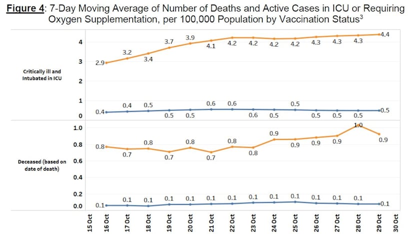 - The number of fully vaccinated patients who were critically ill in ICU was at 0.5 per 100,000 population and for non-fully vaccinated patients, it was 4.4
