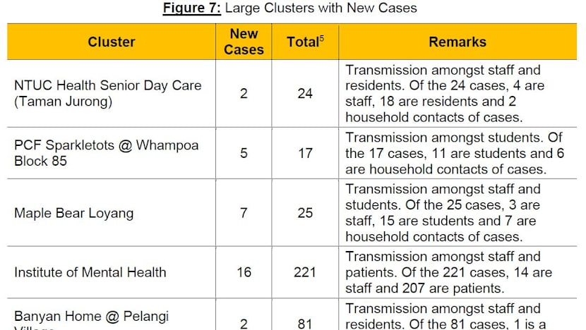 Notably, there were 16 new cases linked to the cluster at the Institute of Mental Health, bringing the tally there to 221. Of the 221 cases, 207 are patients of the psychiatric hospital and the remaining 14 are workers there.