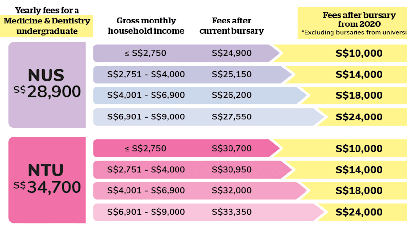 With the current bursary amount, medical studies for a student in that income tier at the National University of Singapore (NUS) cost around S$25,150. But with the increased bursary, he or she will need to pay about S$14,000, based on the current annual fees.