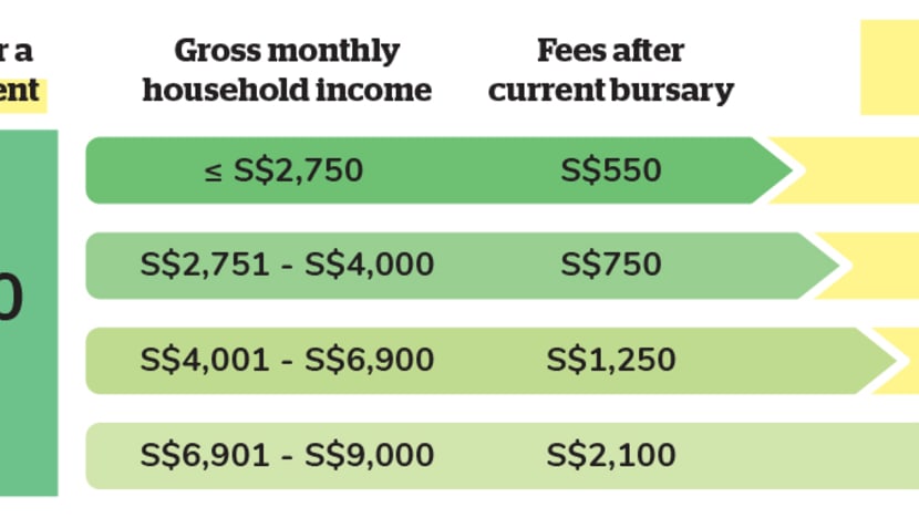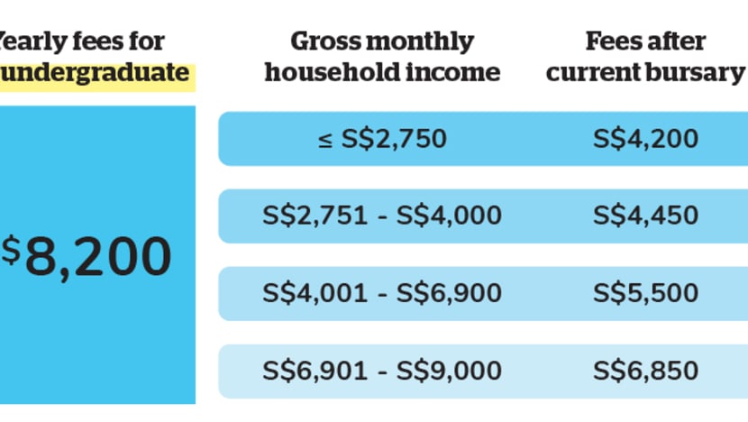 The student currently pays S$4,200 in net tuition fees a year after the current bursary subsidies. But with the increased bursary, he or she will need to pay S$2,000 in net tuition fees a year.