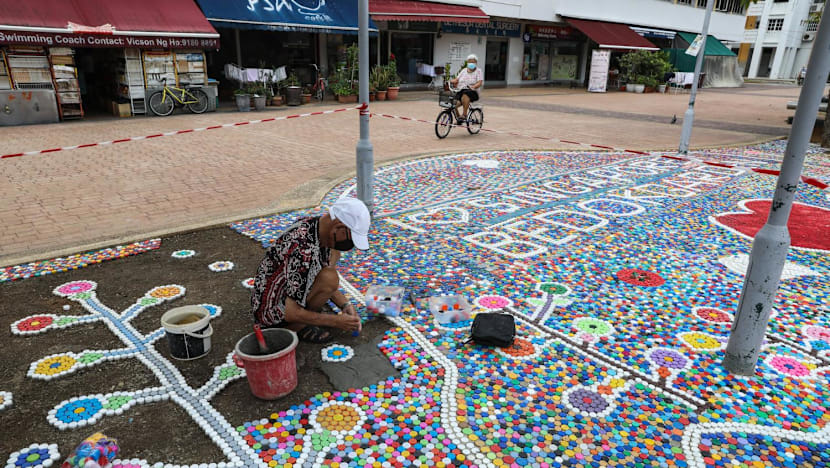 SINGAPORE — On Monday (Dec 26), Mr Sim Boh Huat finally completed a mural in a neighbourhood square in Bedok using 80,000 plastic bottle caps, capping six months of effort that the 77-year-old retiree put in almost every day.
