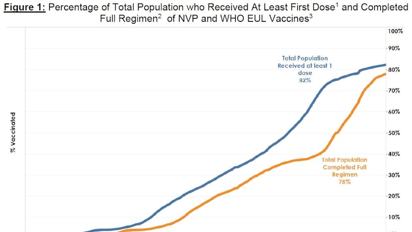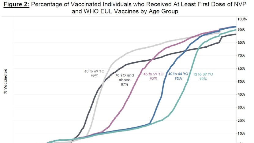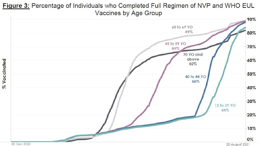As of Aug 22, 78 per cent of the population had completed their full regimen or received two doses of Covid-19 vaccines, and 82 per cent had received at least one dose.