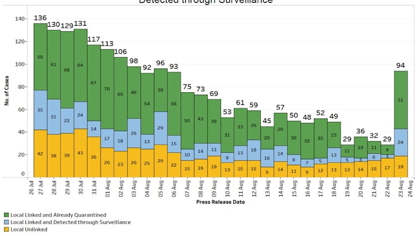 SINGAPORE — Singapore on Monday (Aug 23) recorded 94 new locally transmitted Covid-19 cases, including 19 that are not linked to earlier detected infections.