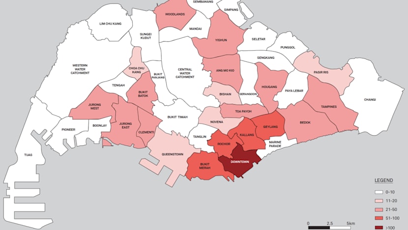 Other areas with high numbers include Bedok, Kallang, Tiong Bahru, Ang Mo Kio, Jurong West, Toa Payoh and Yishun. At least 40 homeless people were identified in these districts.