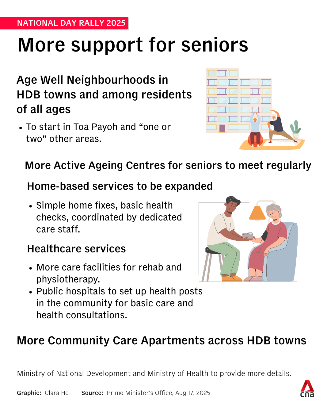 Called Age Well Neighbourhoods, the scheme was introduced by Prime Minister Lawrence Wong in his National Day Rally speech on Sunday (Aug 17).
