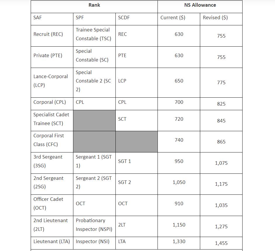SINGAPORE — From July, all national servicemen in the Singapore Armed Forces (SAF), the Singapore Police Force (SPF) and the Singapore Civil Defence Force (SCDF) will receive a S$125 to S$200 increase in their National Service (NS) allowance, depending on their rank and vocation.