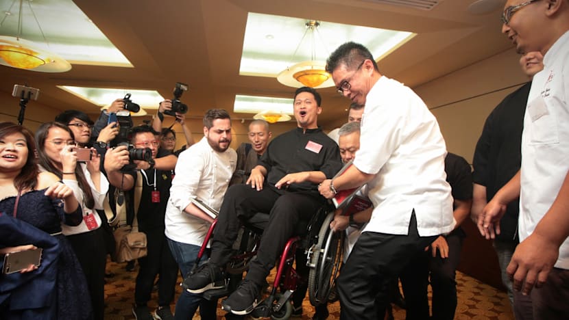 The steps to the stage were an obstacle for the wheelchair user. But his fellow chefs would not take no for an answer.
