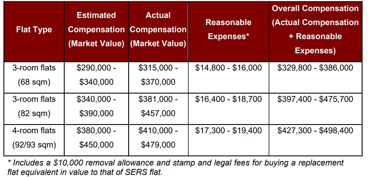 On top of market value compensation, affected flat owners will also receive payment for reasonable expenses, comprising a removal allowance of S$10,000 to defray relocation costs and stamp and legal fees for the purchase of a replacement flat equivalent in value to their SERS flat.