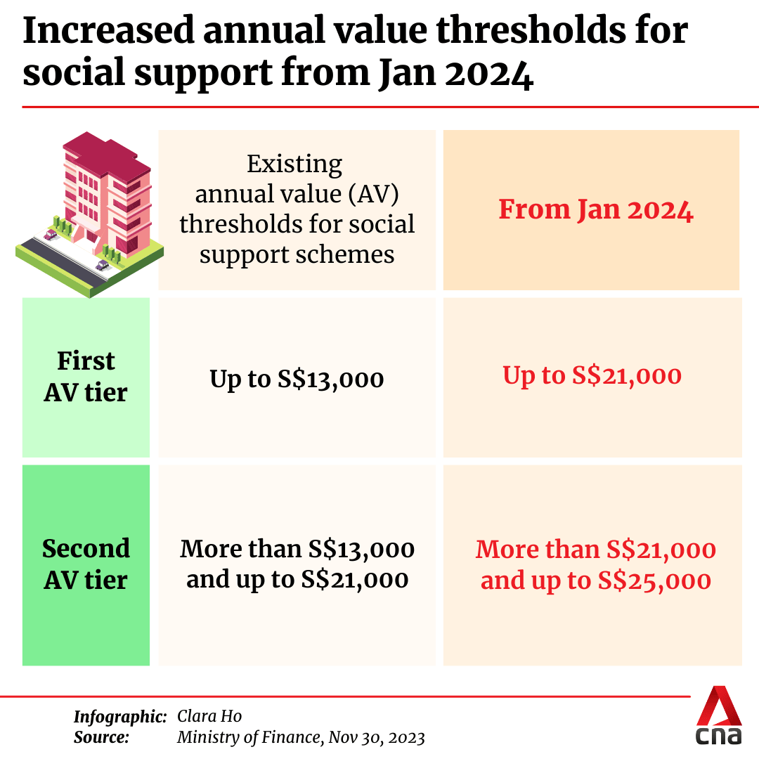 SINGAPORE: The annual value (AV) threshold, one of several eligibility criteria for social support schemes, will be raised in 2024, allowing those in need to continue receiving support.