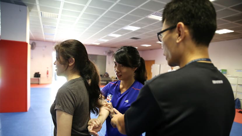 TODAY journalist Kelly Ng seen learning how to handcuff during the basic police defence tactics training.