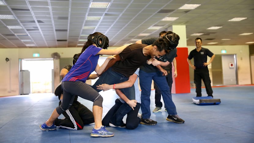 TODAY journalist Kelly Ng (centre) at the basic police defence tactics training. Photo: Koh Mui Fong/TODAY