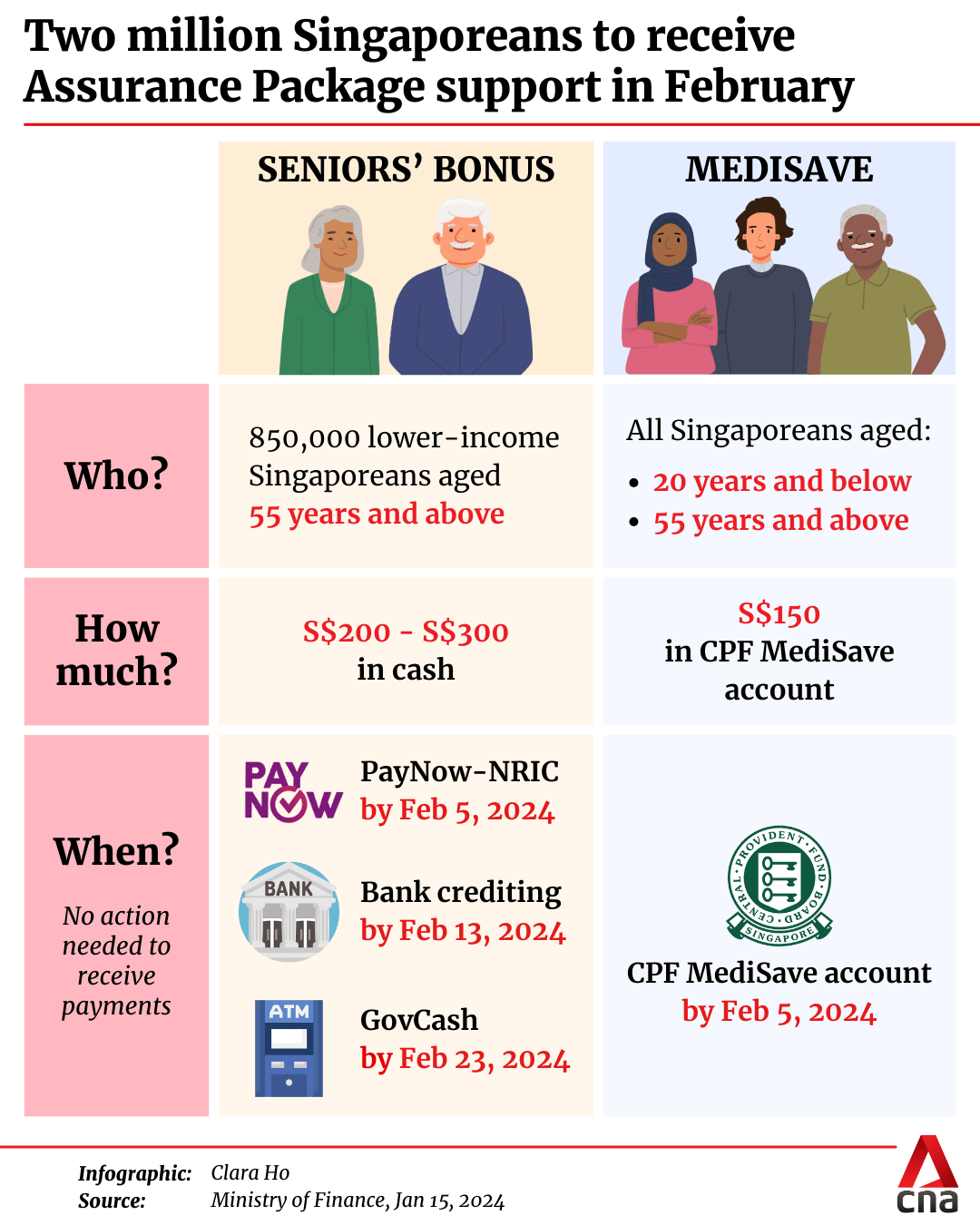 SINGAPORE: About 2 million Singaporeans will receive support through the Assurance Package Seniors’ Bonus and Assurance Package MediSave in February.