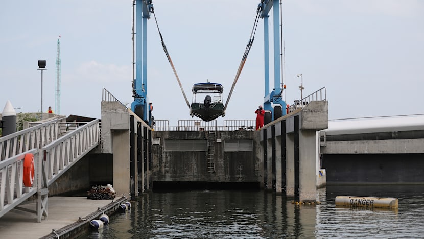 A boat hoist is used to transfer vessels over the barrage. Photo: Raj Nadarajan/TODAY