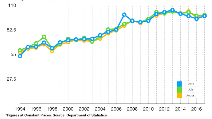 The declining trend was arrested last year when the retail sales excluding motor vehicles rose from June to August, compared with the same period in 2016.