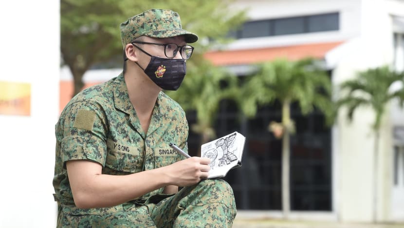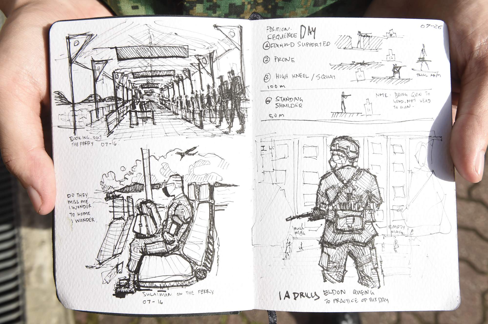 But for Private (PTE) Asher Ong, currently serving his Basic Military Training (BMT) on Pulau Tekong, there is a third thing he brings along wherever he goes: A little black sketch book that fits right into the pocket of his pants.