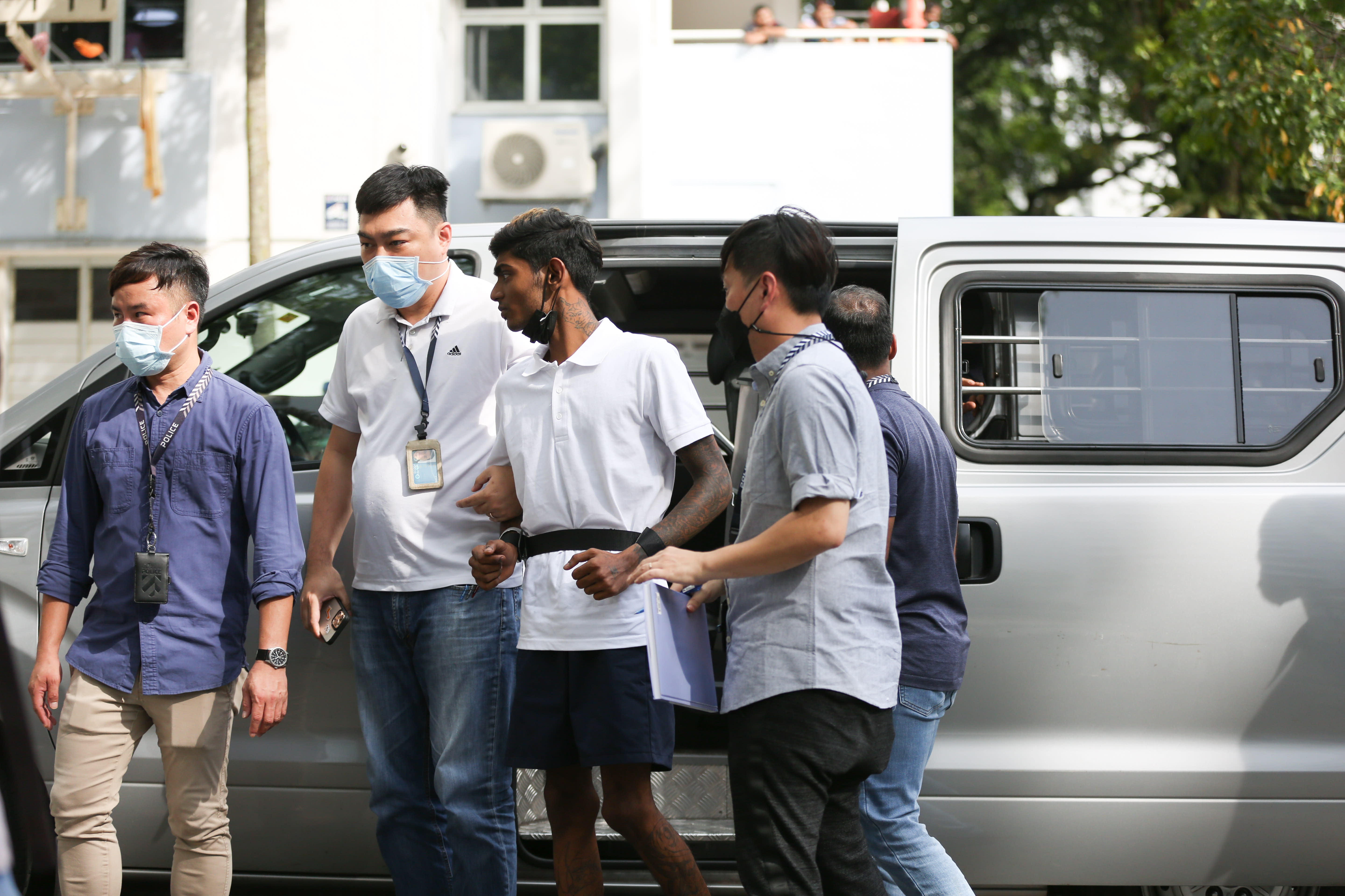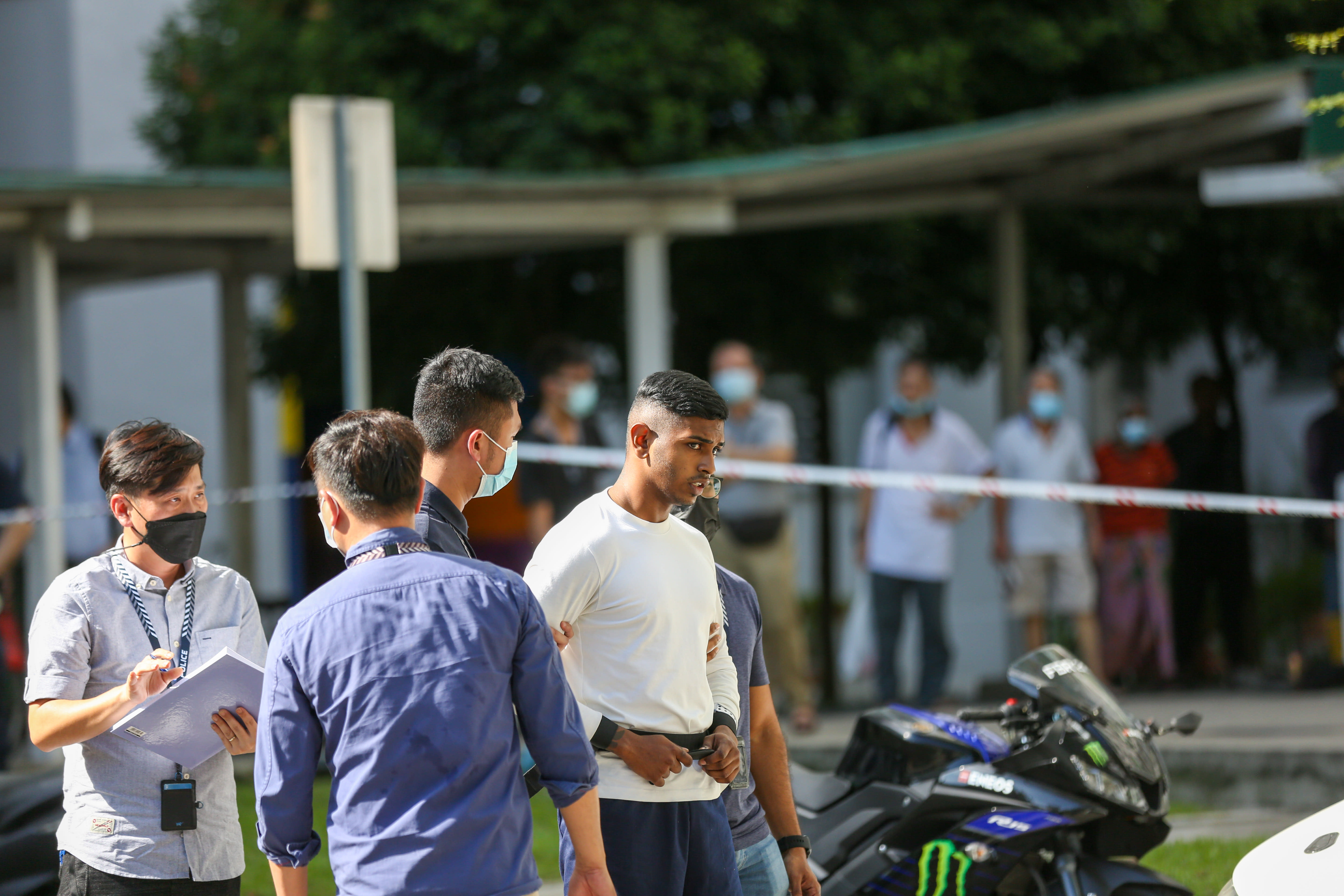 He bowed his head most of the time as bystanders looked on, first taken to the parking lot in front of Block 176 where he was seen responding to questions from an officer.