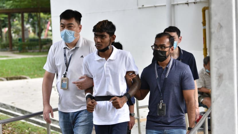 The two suspects involved in the Boon Lay Drive Attack were brought back to the crime scene by the police on Apr 8, 2022. (Photos: CNA/Jeremy Long)