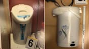 Photos from court documents of the cage allegedly used to confine the boy, and the hot water dispenser purportedly used in the offences.