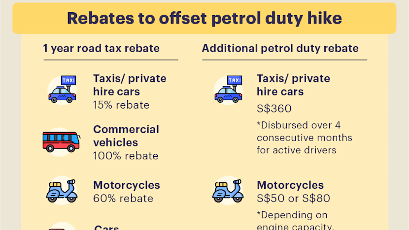 - There will be a one-year road tax rebate to offset the impact of the hike in petrol duty